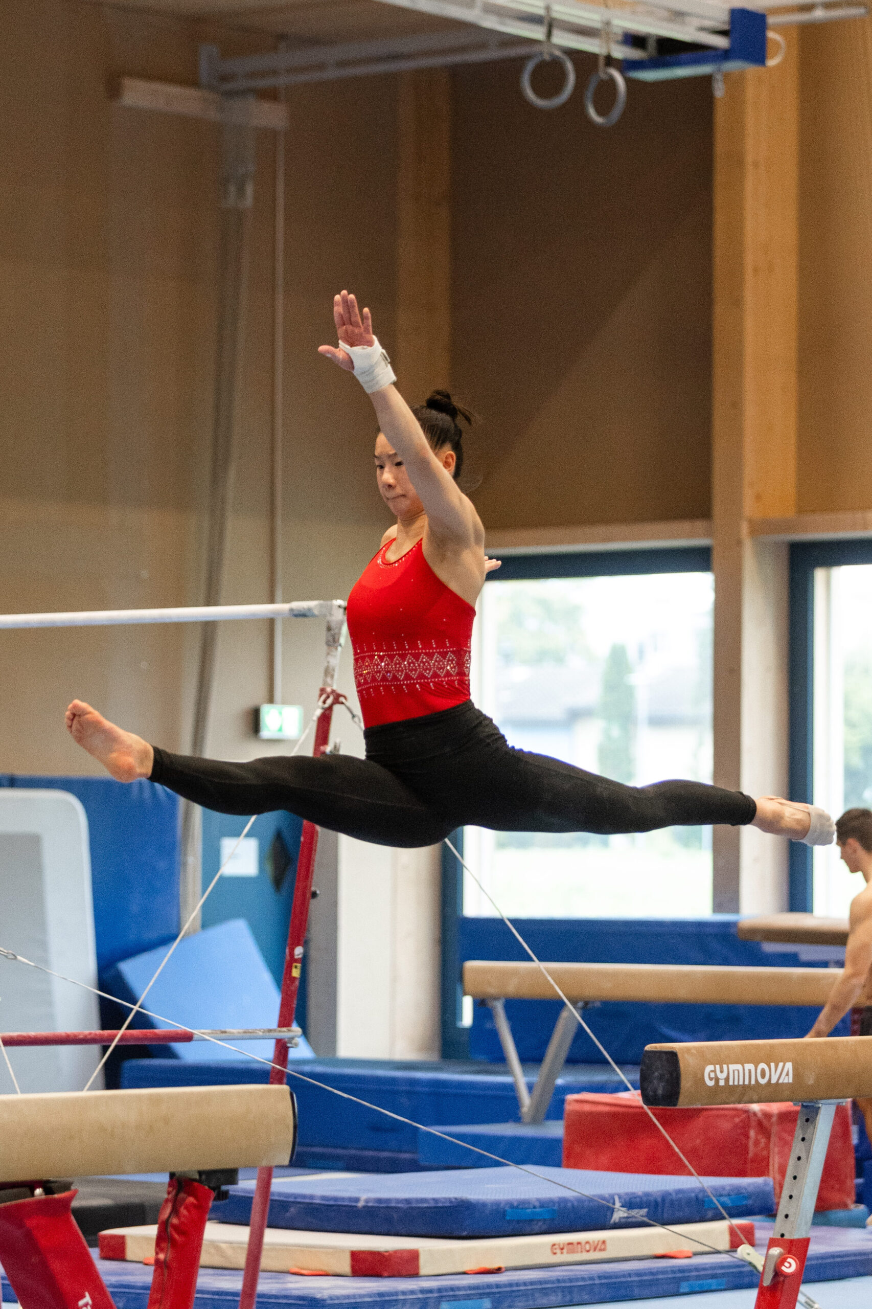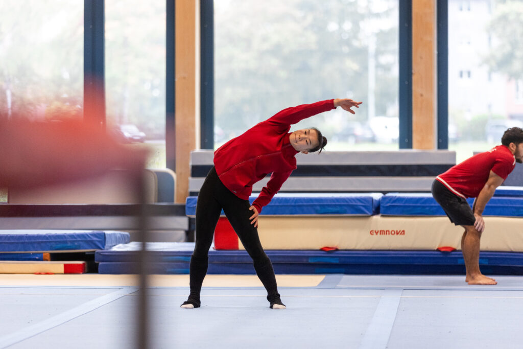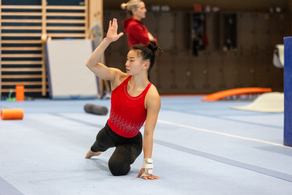Zum Auftakt des Trainings lockert Anny Wu ihren Körper und dehnt sich. Anschliessend arbeitet sie an ihren Elementen – im Sprung, am Boden, am Stufenbarren und auf dem Schwebebalken. Da sie an der WM im Mehrkampf antritt, deckt sie in der Vorbereitung alle vier Disziplinen ab.